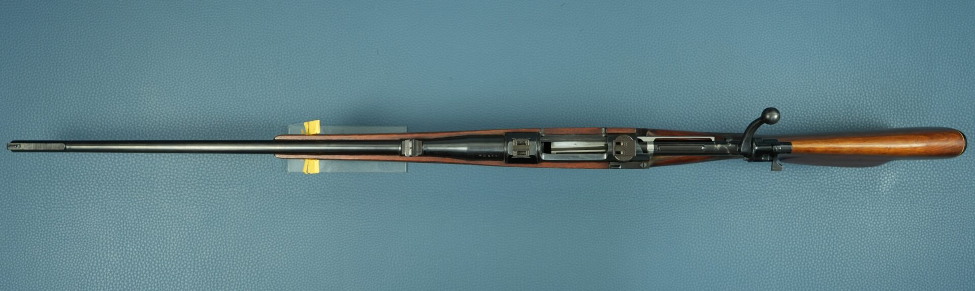 | Bemerkungen: | Deutscher Stecher, Magazindeckel zum Entladen Gesamtläge: ca. 112 cm Lauflänge: ca. 60 cm Länge bis 1. Abzug: ca. 34 cm Länge bis 2. Abzug: ca. 36 cm |