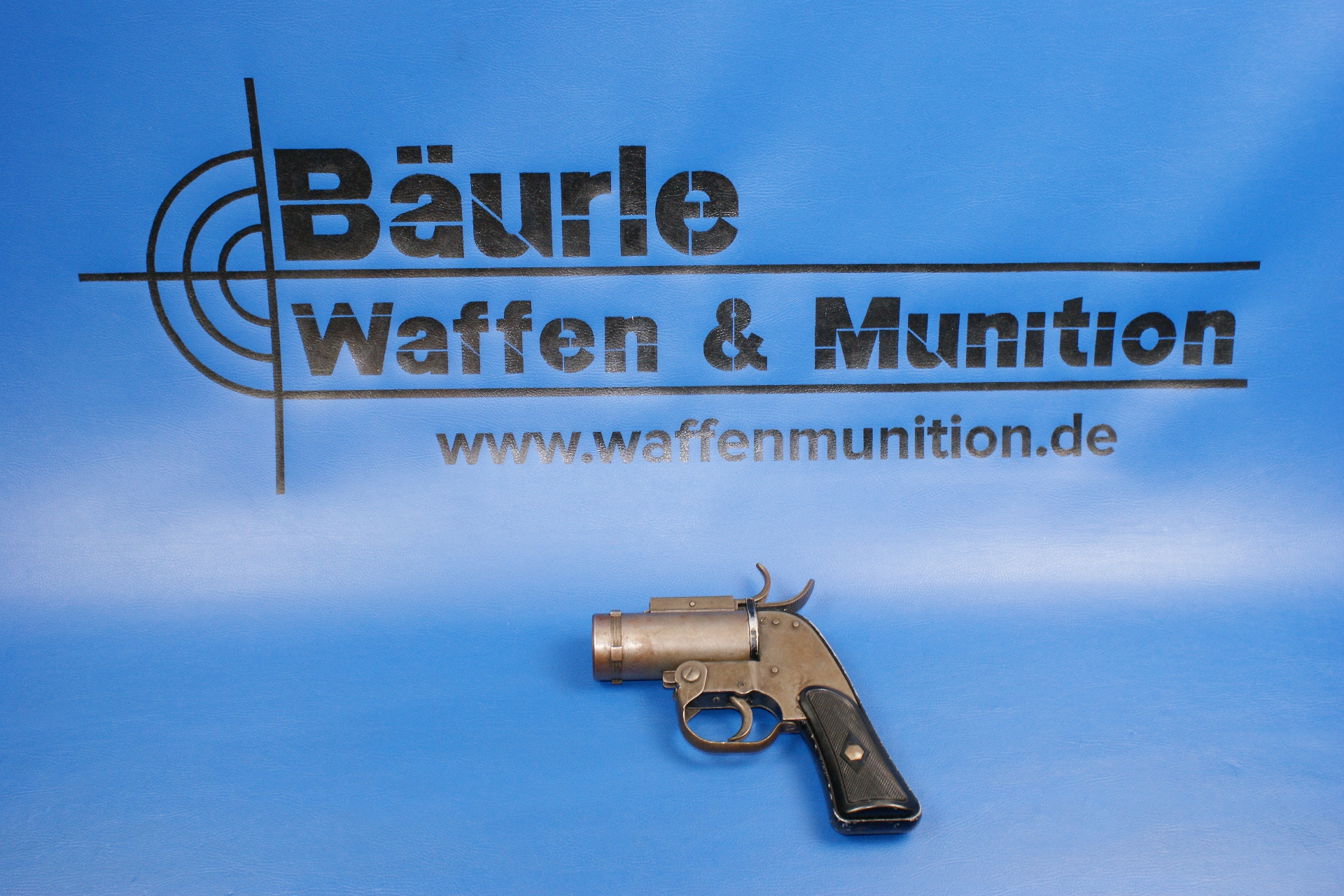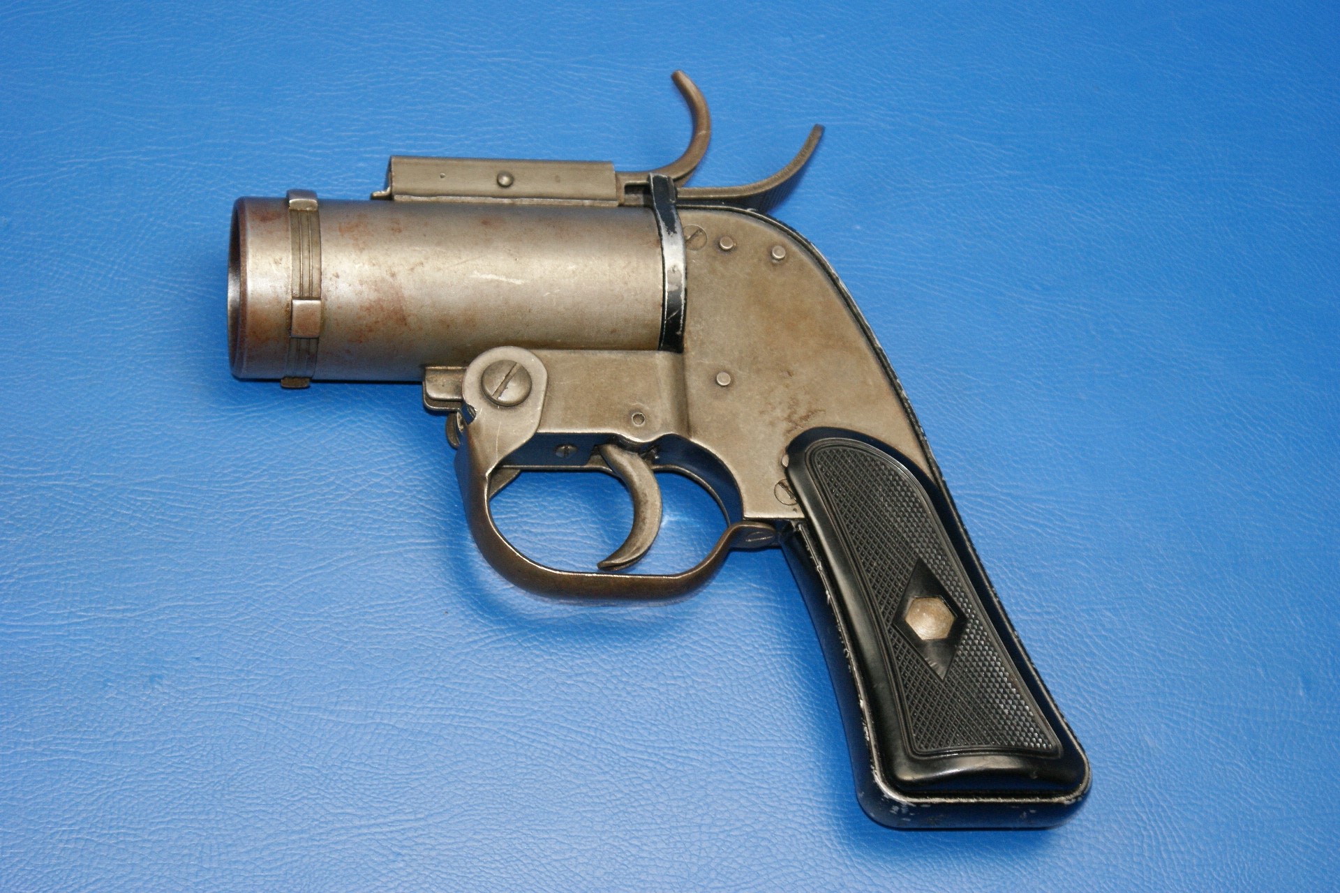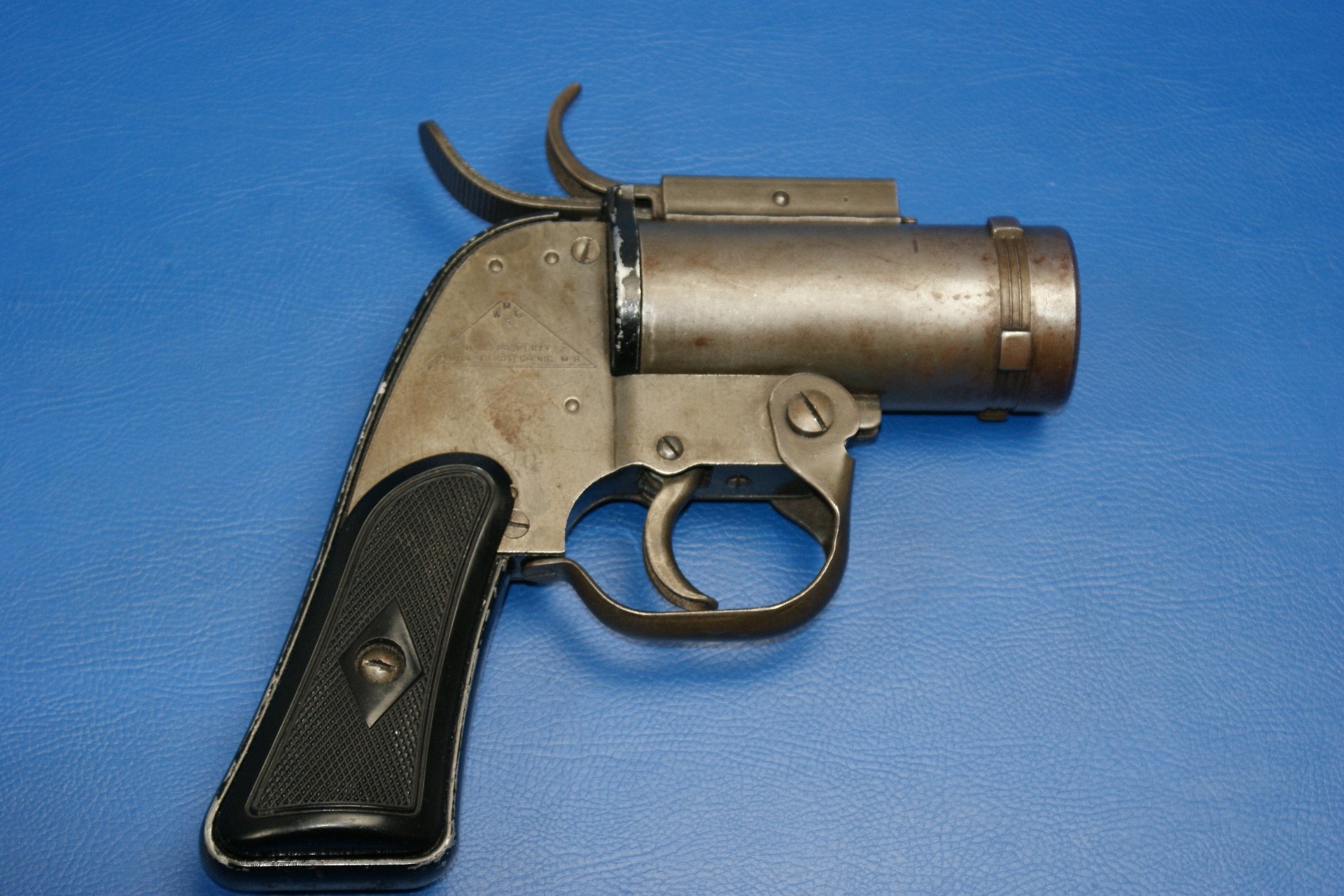 | Pyrotechnic Pistol US AN-M8, Luftwaffe Bundeswehr Lauflänge 4″. Double Action. Rechts am Rahmen im Dreieck Hersteller „M.S.W.C“ (McNery Spring & Wire Co.), darunter „U.S. Property / Pistol Pyrotechnic M8“. Am Griffrücken S/N, am Knauf „P“ und crossed canons. Fertigung in Blechprägetechnik, der Rahmen Alu. Schwarze Kunststoffgriffschalen. |