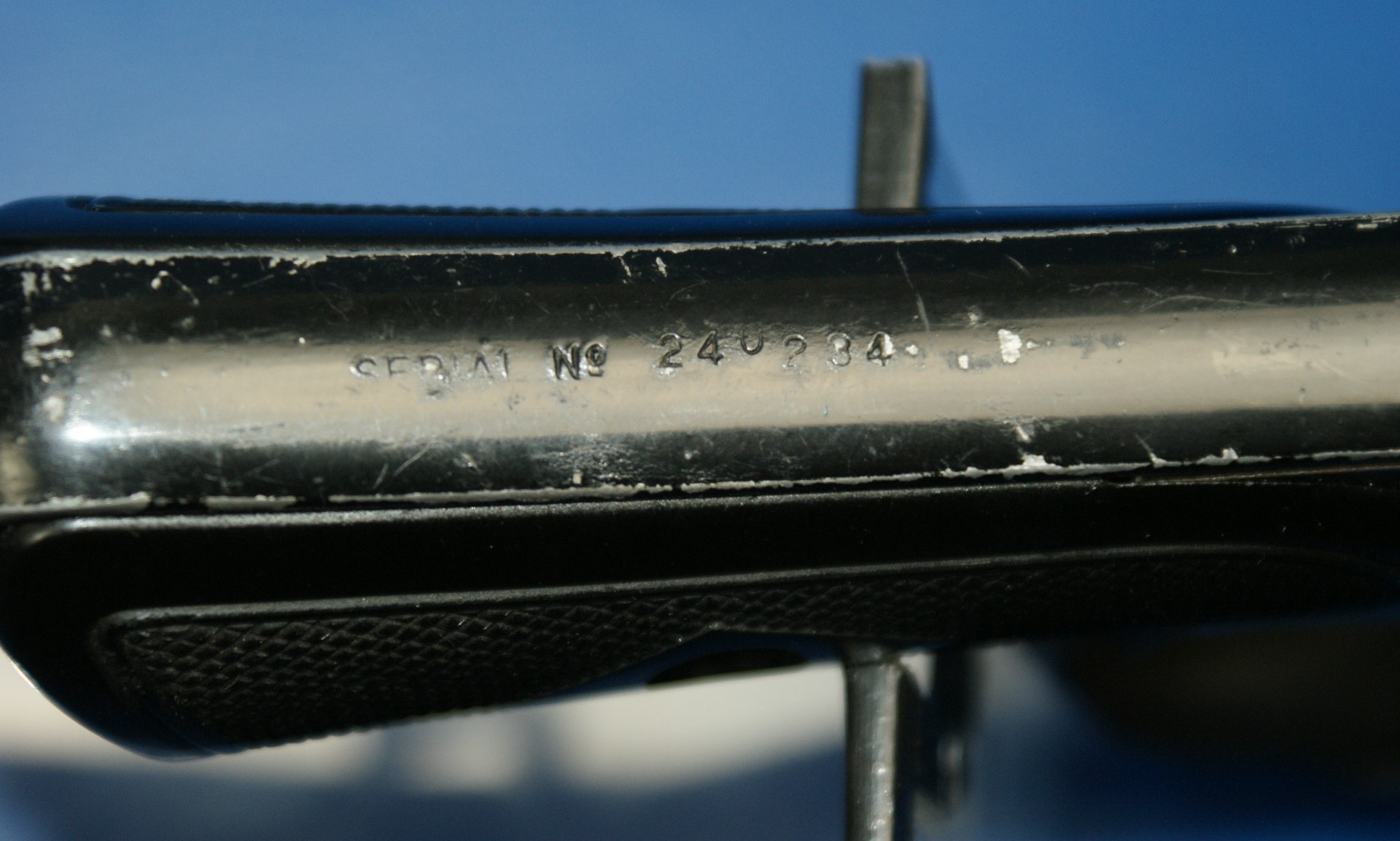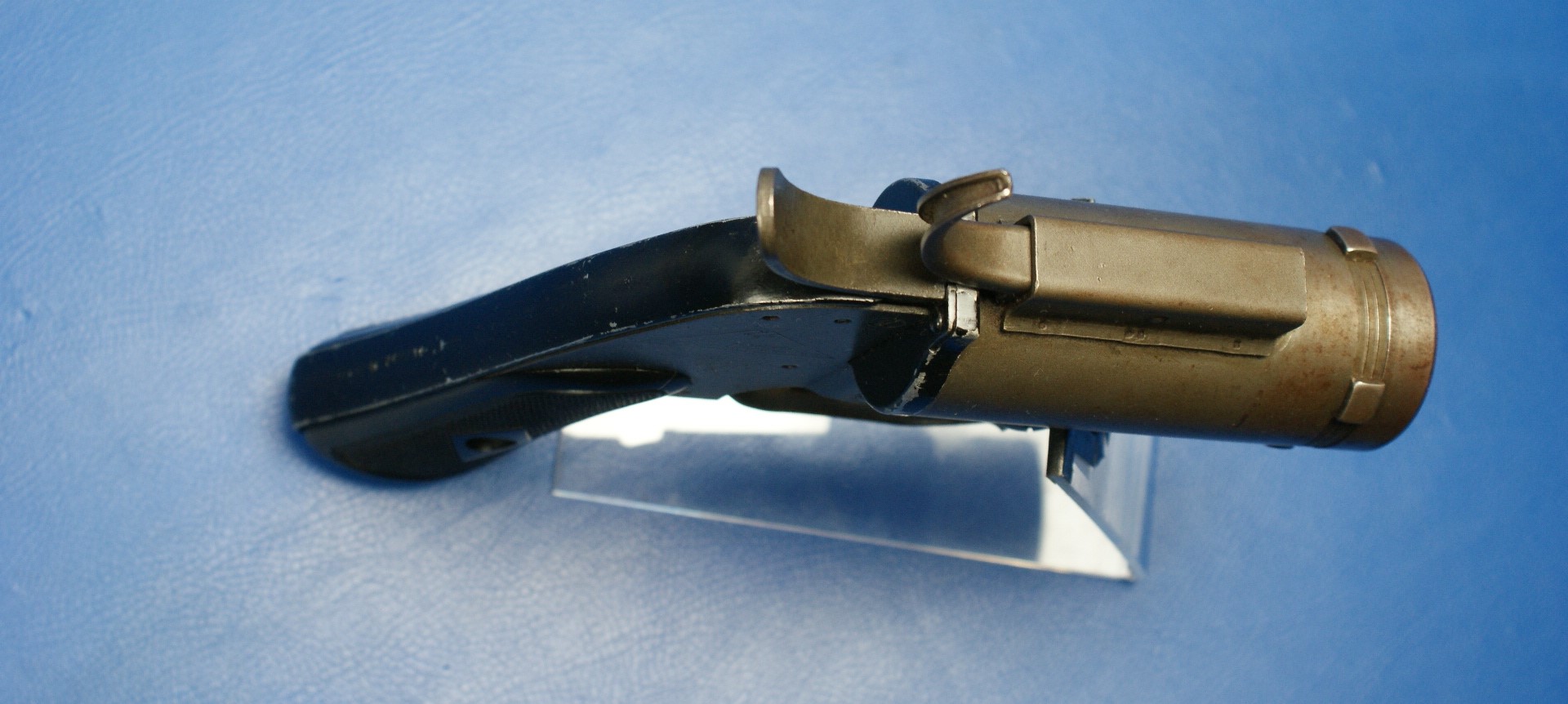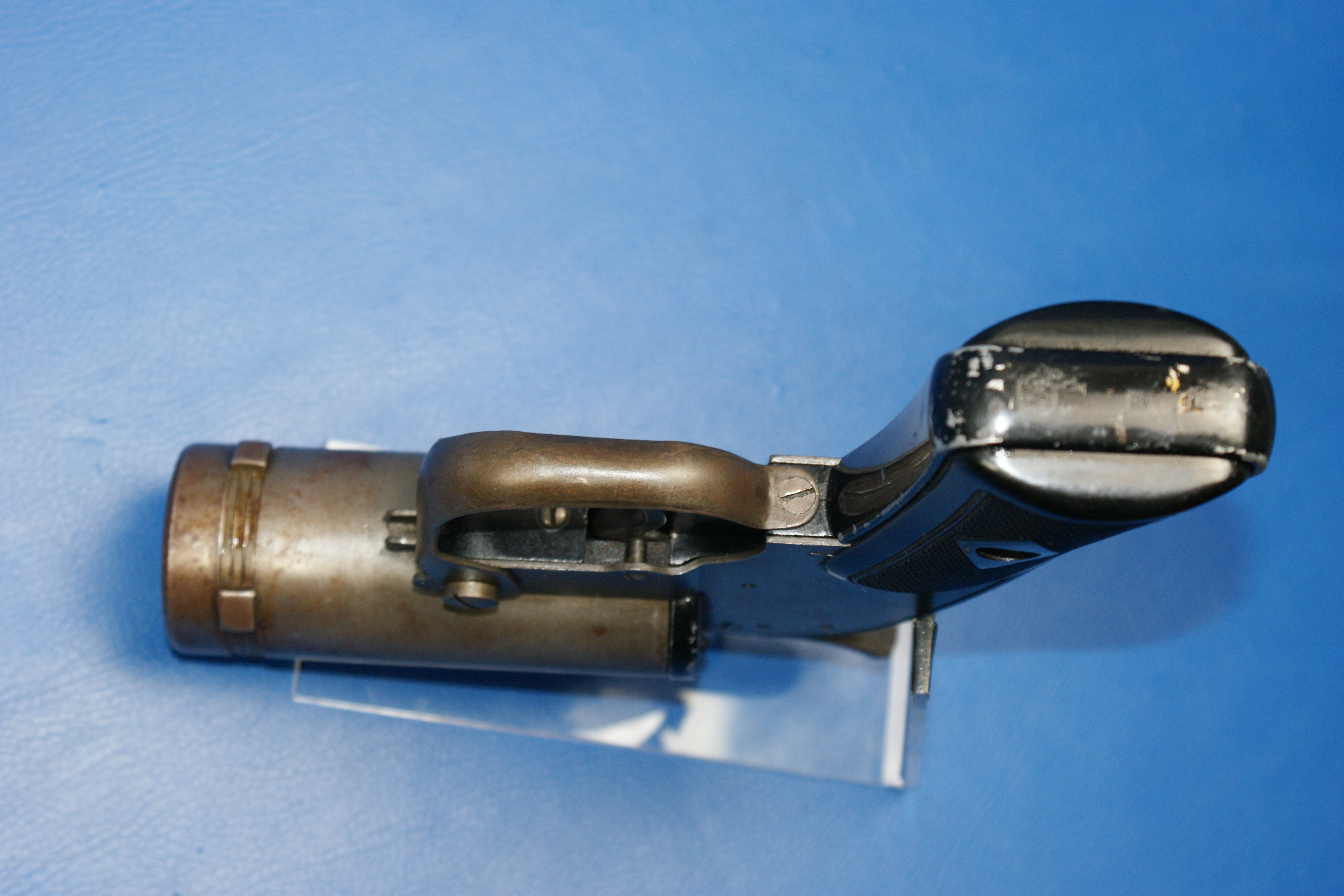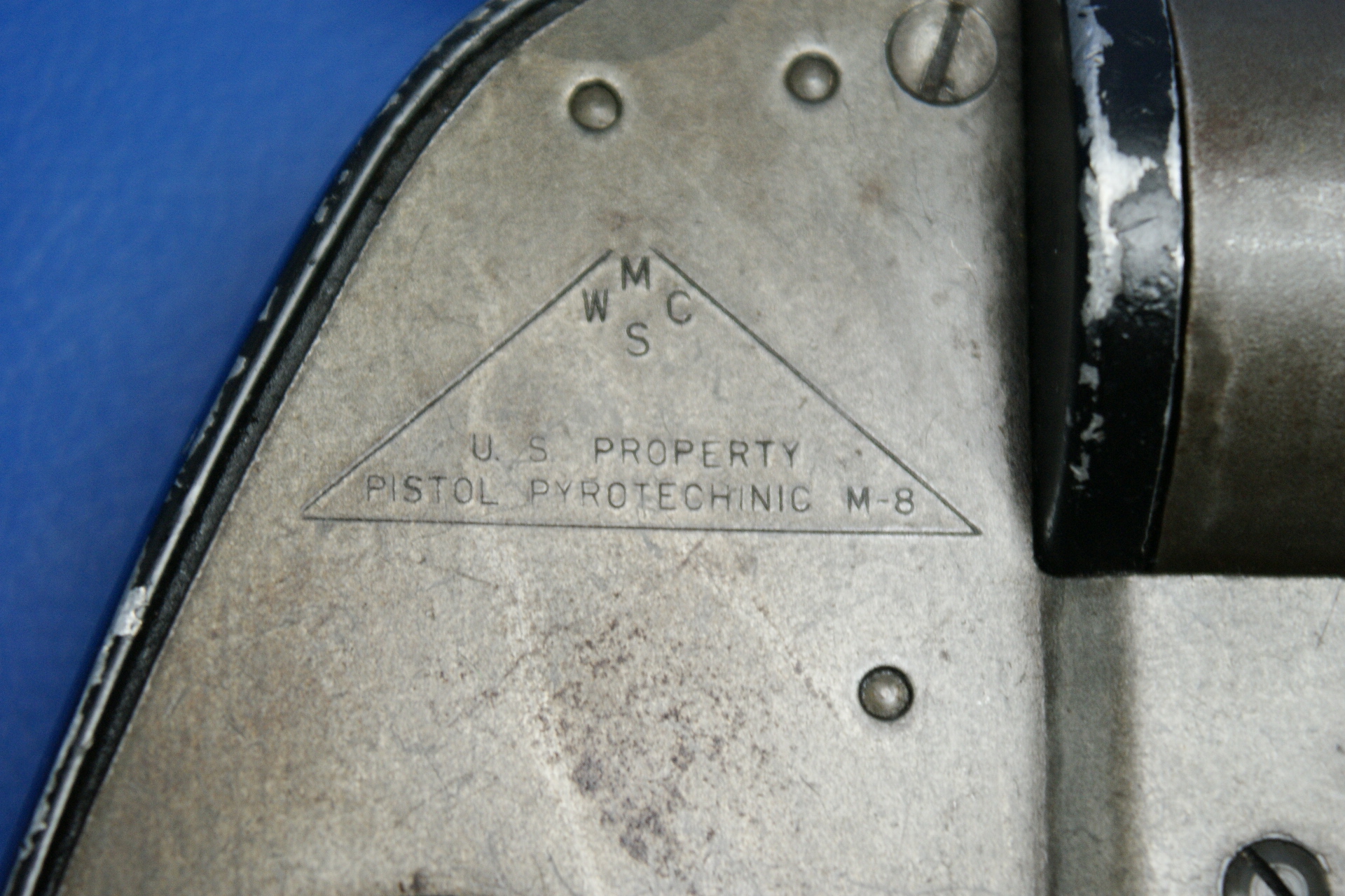 | Pyrotechnic Pistol US AN-M8, Luftwaffe Bundeswehr Lauflänge 4″. Double Action. Rechts am Rahmen im Dreieck Hersteller „M.S.W.C“ (McNery Spring & Wire Co.), darunter „U.S. Property / Pistol Pyrotechnic M8“. Am Griffrücken S/N, am Knauf „P“ und crossed canons. Fertigung in Blechprägetechnik, der Rahmen Alu. Schwarze Kunststoffgriffschalen. |