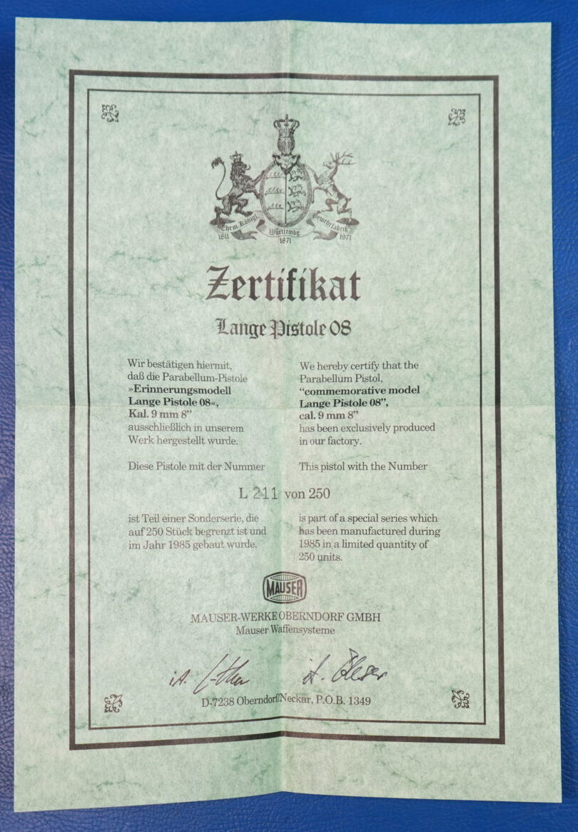 Diese Mauser Parabellum „Erinnerungsmodell Lange Pistole 08“ im Kaliber 9mm ist die Nummer 211.